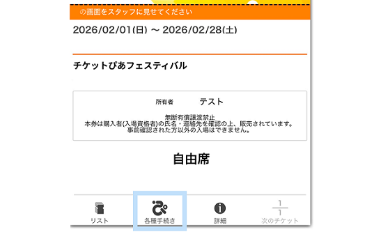 操作したい公演のチケットを表示し、画面下部のメニューにある「各種手続きへ」ボタンから、各種手続きを実施できます。